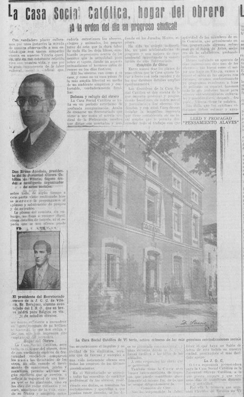 Un par de recortes de revistas: El primero de la revista de fiestas «Vitoria», de  agosto de 1924 donde Valentín Saenz de Santa María ensalza al citado centro por sus valores y vemos fotos de su fundador y sede. El segundo es del Pensamiento Alavés, del 3-8-1935, con fotos del presidente de esa época de Juventud Obrera, Bruno Apodaca y el del secretariado obrero Barajuen, una foto de la fachada y otra de las escaleras de acceso al salón de actos y cine. En ese artículo se cita a la «Comisión de cine» precisamente, que estaba haciendo mejoras, poniendo mejor calefacción, y un «aparato de cine sonoro tan bueno como el mejor de Vitoria», comentaba uno de los obreros.