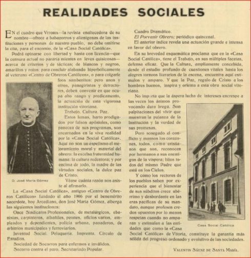 El Centro de Obreros Católicos (luego Casa Social Católica) fue fundado en 1905 por el sacerdote José maría Gómez, para proporcionar a la clase obrera espacios de reunión y entretenimiento. En sus inicios tenía biblioteca, sala de lectura, aulas para dar clases, salas de reuniones, billar, sala de juegos de mesa….. Al principio estuvo en unos locales en Herrería, luego en Cantón de Anorbín y posteriormente en Manuel Iradier.