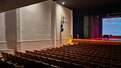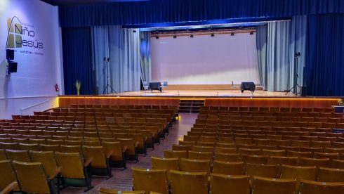Salón teatral del Colegio NIÑO JESÚS: Este gran teatro, aunque lo ponga aquí en la parte de cines-teatros escolares, por su gran importancia también aparecerá en la sección de «Teatros actuales de Vitoria-Gasteiz», ya que, desde que se abrió al público y programan teatro habitualmente, es en el realidad el segundo teatro con más aforo de la ciudad. Estas son fotos propias tras la última obra vista ahí, en  febrero de 2025:
