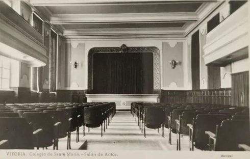 Una foto más del estrado,  en los años 50, (pasada por Fernan Echevarria).En este Salón de Actos del colegio, la parte superior, el anfiteatro, estaba reservada para  charlas y estaba aislado del resto del teatro-cine por una amplia lona . En la actualidad así de chulo se ve este gran salón de actos, su anfiteatro y su patio de butacas (fotos de la web del colegio año 2024):