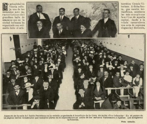 En esta otra foto siguiente, el interior del Parisiana en una velada a favor de La Gota de leche «Pro Infancia», foto de de la Revista Novedades, de 9 de febrero de 1913 (foto Amado), en la foto pequeña, actores amateurs que intervinieron junto a los directores de la función, Valdemoro y Aguilar.