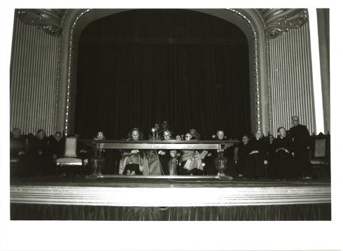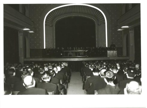 En el SEMINARIO NUEVO también tienen un precioso salón de actos donde programas charlas, seminarios…,  pero también alguna vez cine y teatro.  Aquí tres fotos del estrado y pantalla, la primera sacada de todocolección, de F , las otras, de Schommer Koch en el centenario del Seminario: